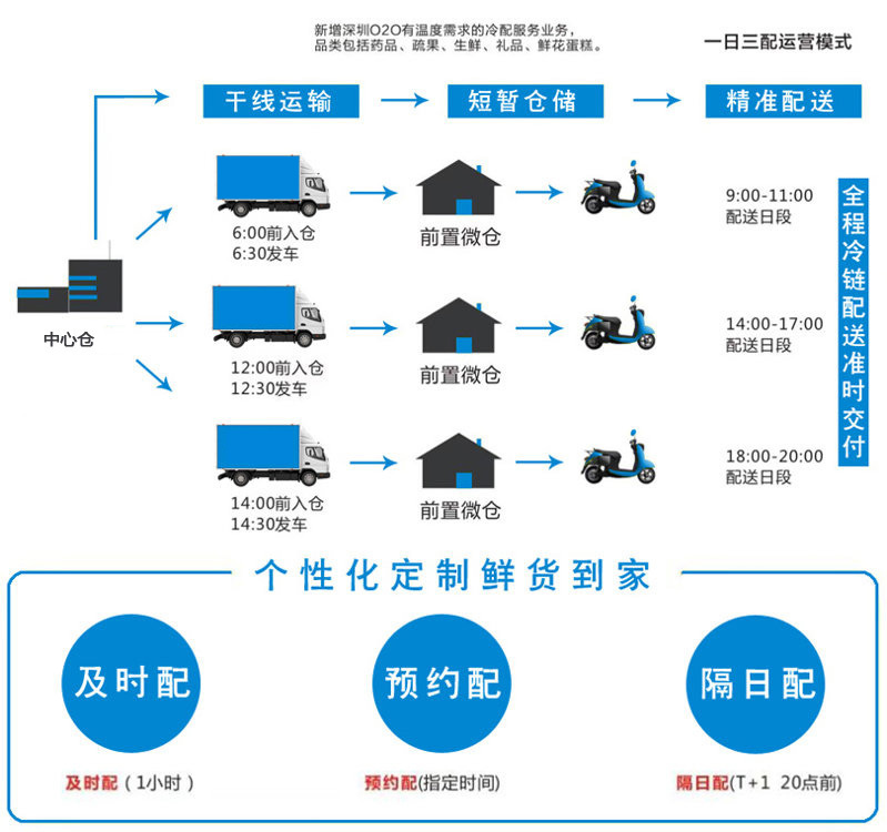 2:城市各区域建立冷链前置仓,所有需大香蕉电影网的客户货物,统一从总仓按照标准时间送至各区域冷链前置仓,以共配原则为基础,有效的降低了运营成本,同时客户收货时间也变得灵活多样,客户也可选择前置仓自提。